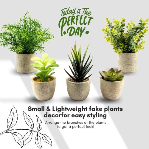 TRNZ Decorative Artificial Plants in Pots Set of 5 – Small Plastic Fake Plants Indoor with Pot – Eucalyptus Rosemary Succulents Mini Faux Plants for Wall Desk Bedroom Decoration